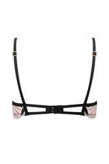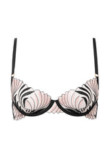 The Katerine Embroidered Sheer Bra in black is an exquisite tri-tone bra featuring a fan style embroidery on a sheer ground mesh. This Art Deco style design includes scalloped trim decorating the cups, band, and wings. Underwired for support and subtle lift, with adjustable shoulder straps and rear hook and eye fastening for a perfect fit.