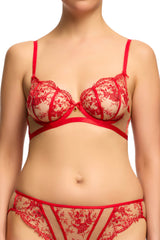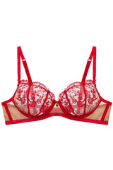 Dita Von Teese created Femmoiselle combining her love of embroidered detailing on sheer tones. The flame red Femmoiselle bra is a sheer embroidered underwire bra with contrast design lines and lurex highlights and heirloom ruby trinket.