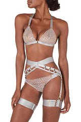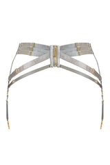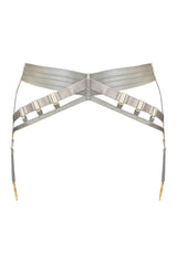 Sophisticated satin elastic suspender in Platinum. Adjustable through the back straps for a personalized fit.