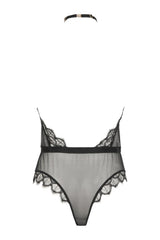 Completely transparent backless bodysuit in black tulle, a graphic belt highlights the waist. Strips of light lace envelop the body and enhance the silhouette. Closing in the neck with a golden magnet with the possibility of adjustments. G-string shape with a reminder of lace.