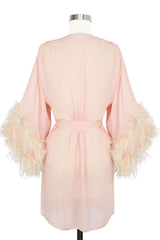 Oooh la la--the Mini Glamour Robe with Ostrich Feathers is a must-have addition for your lingerie collection! Above the knee length, sheer rayon georgette hugs your curves as tightly or loosely as you desire. A matching rayon georgette sash ties at the waist and ostrich feathers adorn the sleeves, adding a touch of luxury to a very wearable sexy robe. Choose your usual size to show skin with an alluring open front, or size up to cross-over for more modesty.