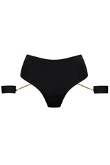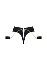 Symbol of boldness and absolute pleasure, the Tapage Nocturne High Waist Thong is characterized by a sublime high waist that dress the curves with a subtle opening at the crotch before an additional slit at the back. The Nocturne Tapage thong comes with matching handcuffs linked by a golden link. Ideal for the most indecent games.