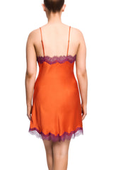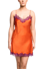 The Scarlett Silk Chemise by Sainted Sisters is a beautiful luxury garment made in pure orange spritz silk with detailed blackberry eyelash lace at the neck, back and around the hem to be worn as luxury lingerie or show it off as a slip dress.