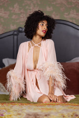 This dreamy vintage inspired lingerie collection features sheer georgette and draped stretch satin in pieces that range from bias cut 1930s to Dynasty 1980s. The soft and elegant peach and classic black are both available in most of these new designs. Trimmed in feathers and fringe, you can luxuriate in style!