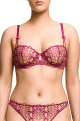 Like its namesake, Harlow evokes sensual glamour. Dita designed a rich embroidery on her signature illusion mesh. The embroidery creates an" illusion" of peek a boo cut outs. The Harlow bra has sheer embroidered cups with tuille inserts for lift and shape. The bra has pretty shoulder straps, satin bows and rose crystal trim.