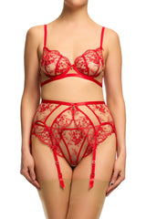 The Femmoiselle Suspender features the delicate floral embroidery throughout which is highlighted by the dramatic contrasting design lines. The suspender features 6 garter attachments for stability and function and an heirloom ruby trinket.