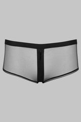 The openable shorty – Pure Tentation presents itself as a bold yet controlled statement. Its low-rise cut gently highlights the hips, while ultra-sheer tulle blurs the line between fabric and skin. A zip opening at the crotch adds an unexpected touch—both functional and highly suggestive. Without cotton lining, the piece maintains its fluidity and second-skin effect.